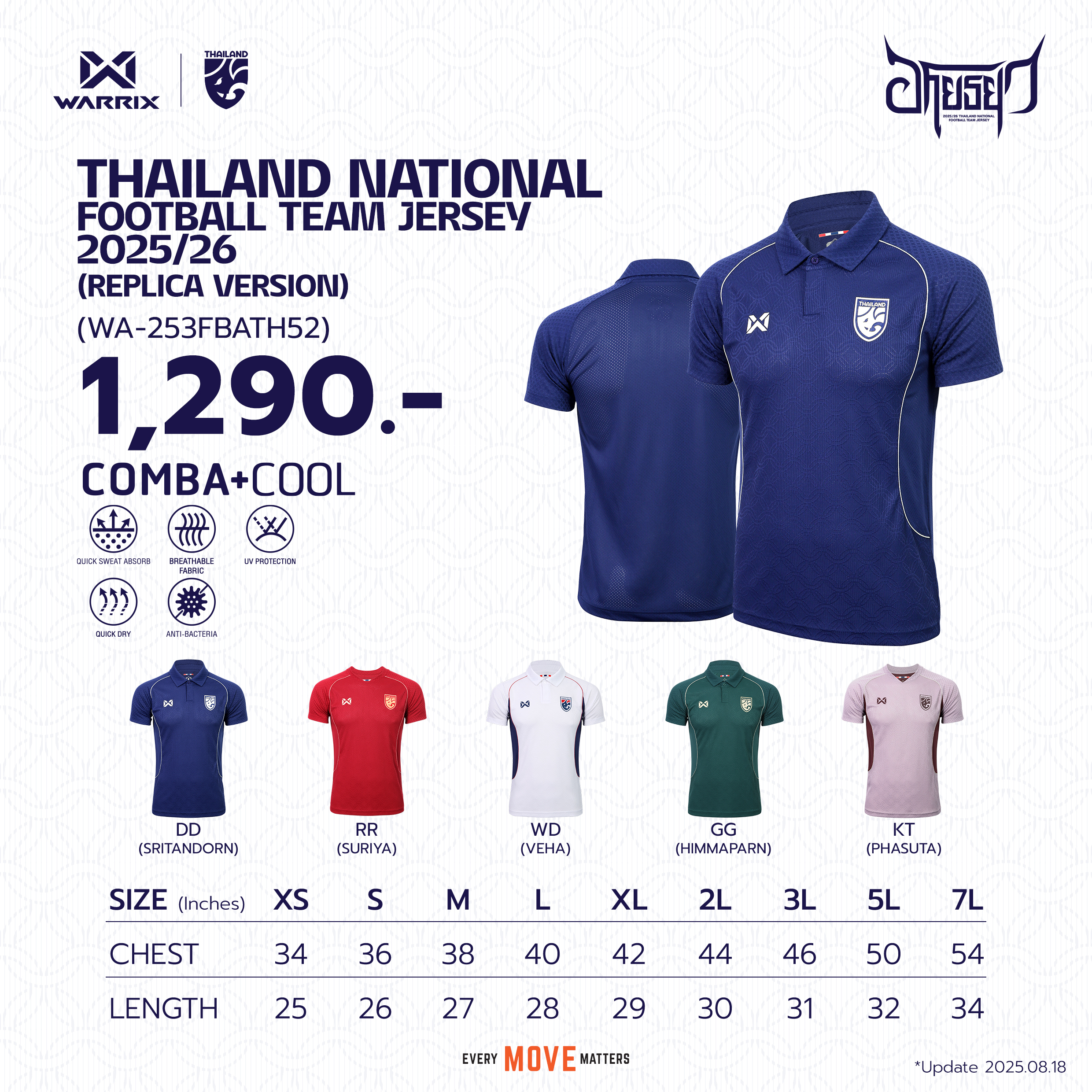 เจอร์ซีย์ทีมชาติไทยเวอร์ชั่นแฟนบอล (Replica Version) ฤดูกาลใหม่ล่าสุดจาก Warrix ที่ออกแบบภายใต้แรงบันดาลใจจาก “อโยธยา” ดินแดนแห่งประวัติศาสตร์และศิลปะที่สง่างาม ถ่ายทอดผ่าน ลวดลายแก้วชิงดวง – อัตลักษณ์ที่สะท้อนพลัง ความงดงาม และความเป็นเอกลักษณ์ของชาติไทย ด้วยนวัตกรรมผ้า COMBA+COOL ที่ให้สัมผัสเบา นุ่ม ระบายอากาศได้ดี และปกป้องจากรังสี UV ทำให้ใส่สบายได้ทั้งในสนามเชียร์และในชีวิตประจำวัน Warrix ได้ถ่ายทอดหัวใจของนักรบไทยสู่ 5 โทนสีแห่งจิตวิญญาณอโยธยา โดยยกระดับมิติการตั้งชื่อให้ทันสมัย พร้อมเนื้อหาที่กลมกลืนระหว่าง “เอกลักษณ์แบบไทย” เข้ากันกับ “สากลนิยม” สู่ 5 อัตลักษณ์ใหม่ที่ไม่ได้แค่บ่งบอกถึงพลัง แต่ยังสื่อถึง “พลังสามัคคี” ที่ทุกคนสวมใส่ได้อย่างสง่างาม ไม่ว่าคุณจะอยู่ตำแหน่งใดของสนาม หรือเป็นใครในชีวิตจริง